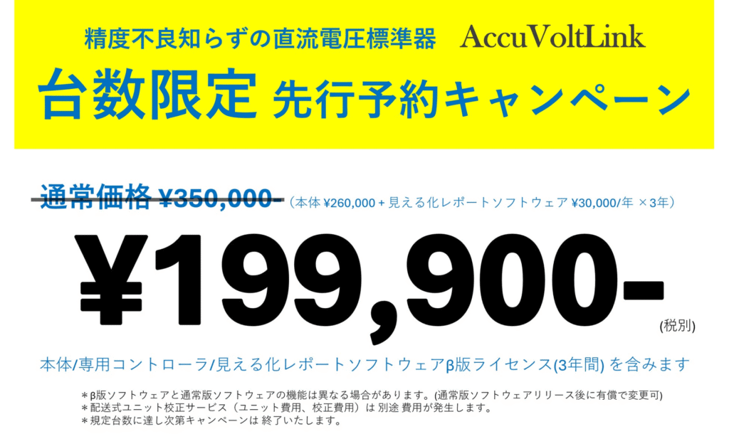 AccuVoltLink 先行予約キャンペーン開始 2025年11月6日 最終更新日時 : 2025年11月6日 accuvoltlink_admin 税抜標準価格 \350,000- のところ 2026年1月31日まで \199,900- の特別価格で先行予約を開始しました。 お問合せ、お見積依頼、サンプル機の貸出など 下記までお問合せ下さい。 info@accuvoltlink.jp Follow me! Bluesky